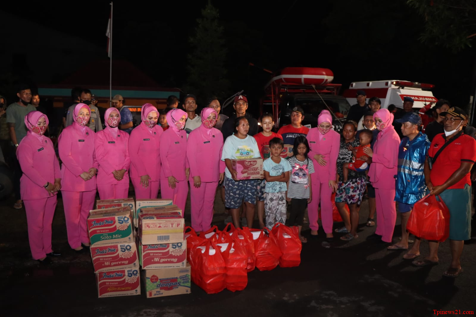 Berbagai kebutuhan makanan dan minuman mulai dari nasi kotak, sembako, mie instan, susu, pampers, dan vitamin disalurkan Bhayangkari kepada para pengungsi,