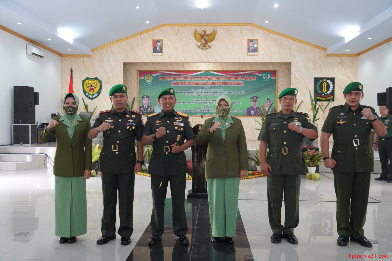 TPINEWS21.COM – BANTEN | Danrem 064/MY Brigjen TNI Yunianto pimpin upacara penyerahan jabatan Dandim 0602/Serang dan tradisi satuan, yang dihadiri oleh Para Kasi Korem 064/MY., Para Dandim Jajaran Korem 064/MY, Para Ka Balak Aju jajaran Korem 064/MY , Danyonif 320/BP, Ketua Persit KCK Koorcabrem 064 PD III Siliwangi bertempat Aula Makodim 0602/Serang, Kamis (11/8/2022).