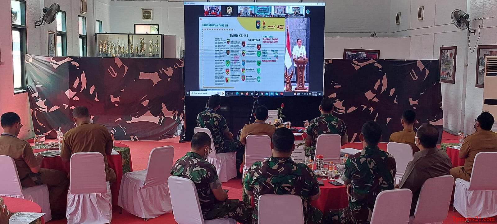 Guna lebih mengoptimalkan pencapaian dalam kegiatan TMMD ke-114, Danrem 064/MY Brigjen TNI Yunianto yang diwakili Kasrem 064/MY Kolonel Inf Nurkhan mengikuti Rakornis TMMD ke-114 melalui Vicon di Aula Makodim 0603/Lebak. Selasa ( 19/7/2022 ).