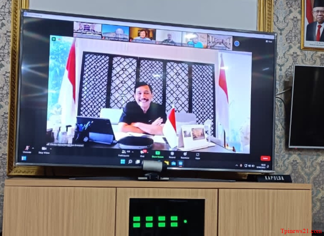 Kegiatan zoom meeting dipimpin langsung oleh Menko Marves Luhut Binsar Pandjaitan dihadiri oleh Kabid Dokkes Polda Banten Kombes Pol Dr. Agung Widodo didampingi Kabagdalops Biroops Polda Banten AKBP Kam’ndyah serta Kabagbinopsnal Ditbinmas Polda Banten AKBP Sutrisno.