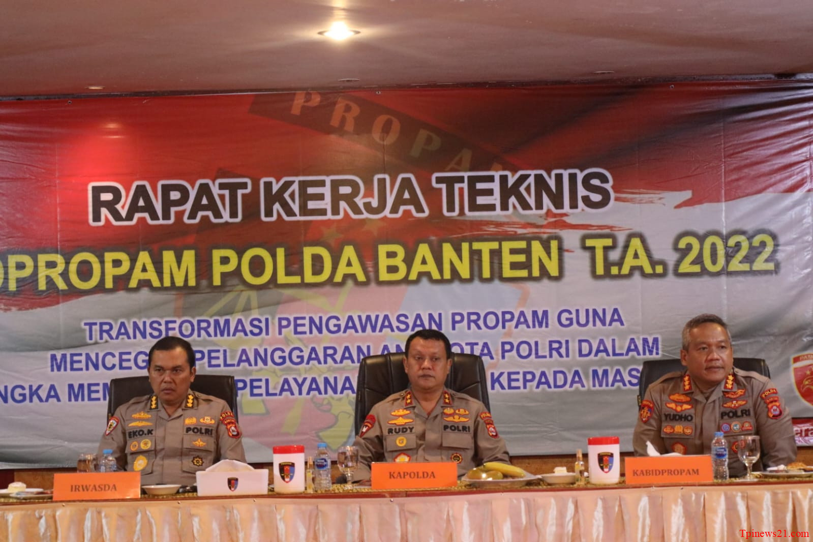 TPINEWS21.COM – BANTEN | Kapolda Banten Irjen Pol Prof. Dr. Rudy Heriyanto membuka Rapat Kerja Teknis (Rakernis) Bidang Profesi dan Pengamanan (Bidpropam) Polda Banten tahun 2022, kegiatan mengambil tema Transformasi pengawasan Propam guna mencegah pelanggaran anggota Polri dalam rangka memberikan pelayanan optimal kepada masyarakat yang dilaksanakan di Hotel Le Dian Kota Serang. Pada Selasa (12/072022).